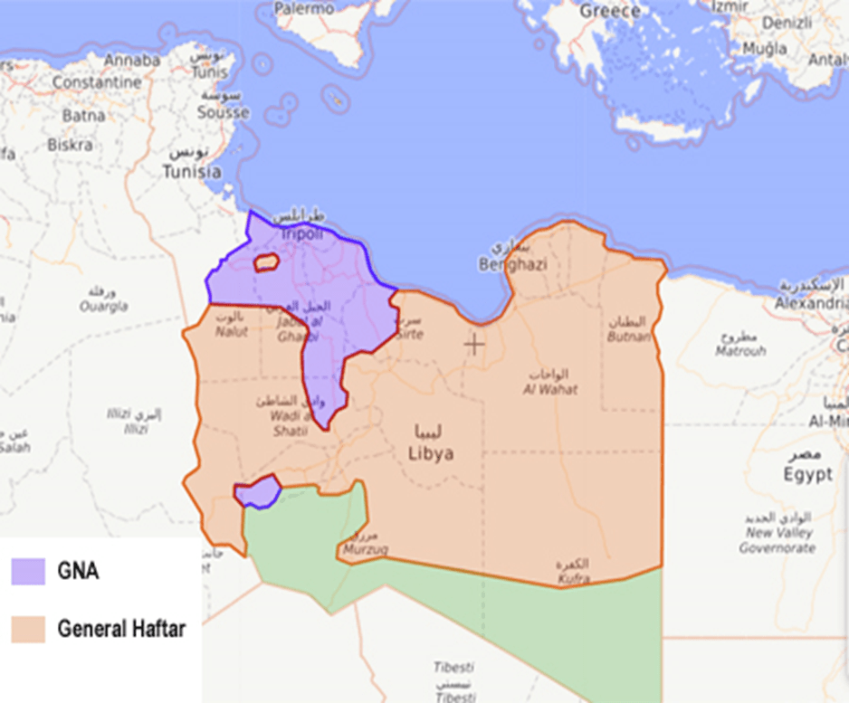 - In rosso il governo guidato dal generale Khalifa Haftar che controlla la Cirenaica, parte del Fezzan e della Tripolitania.