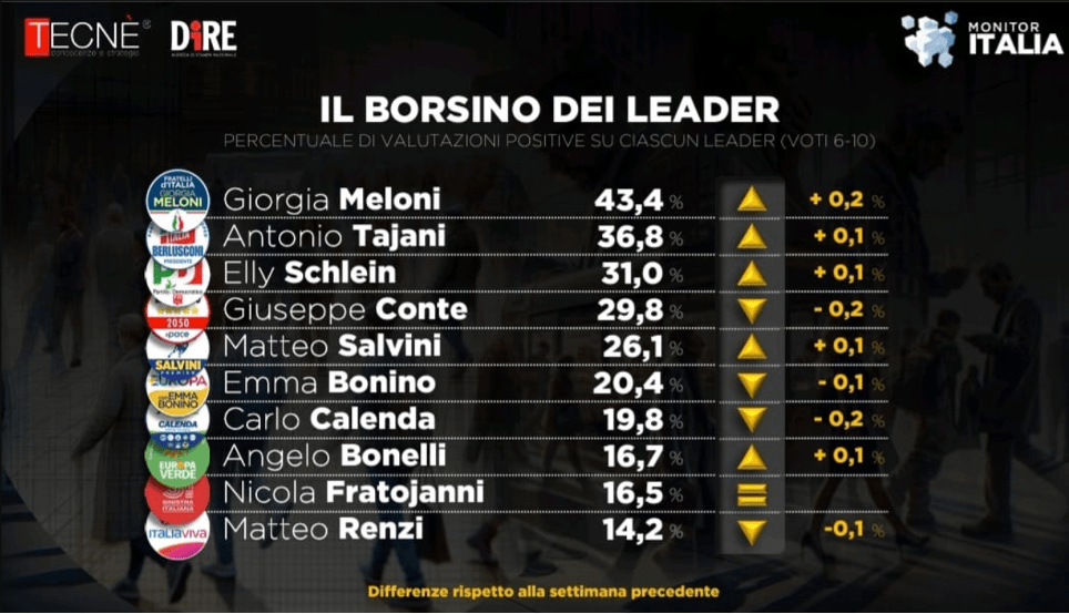 Secondo il sondaggio realizzato da Tecnè per Dire del 3 ottobre, la fiducia per il Presidente del Consiglio continua a crescere, mentre a nulla stanno servendo per adesso gli sforzi di Conte, che anzi perde terreno proprio in favore di Elly Schlein. Un valore sorride all’opposizione: la sfiducia al Governo diminuisce ma resta molto alta.